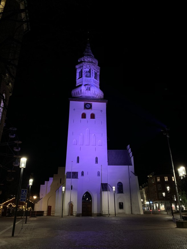 Aalborg domkirke aka Budolfi har i forbindelse med renoveringen af Budolfi Plads fået nyt lys på sig. Lilla er fra gammel tid bodsfarven, så tiden op til jul – adventstiden er både indadvents – og ventetid.