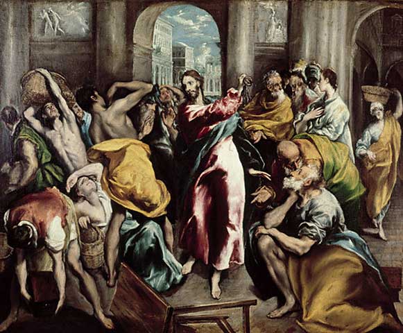Men knap har Jesus passeret byporten, før han sætter kursen mod templet – og gennemfører den nok så berømte tempelrensning. Rundt templet var der fyldt med handelsborde, her kunne folk købe alverdens offerdyr: alt fra store fede okser til velvoksne priser – til små undseelige 3-for-en-10’er duer, som de derefter bragte til alteret og på god gammeldags maner ofrede til Gud. I håbet om, at finde nåde for hans ansigt.